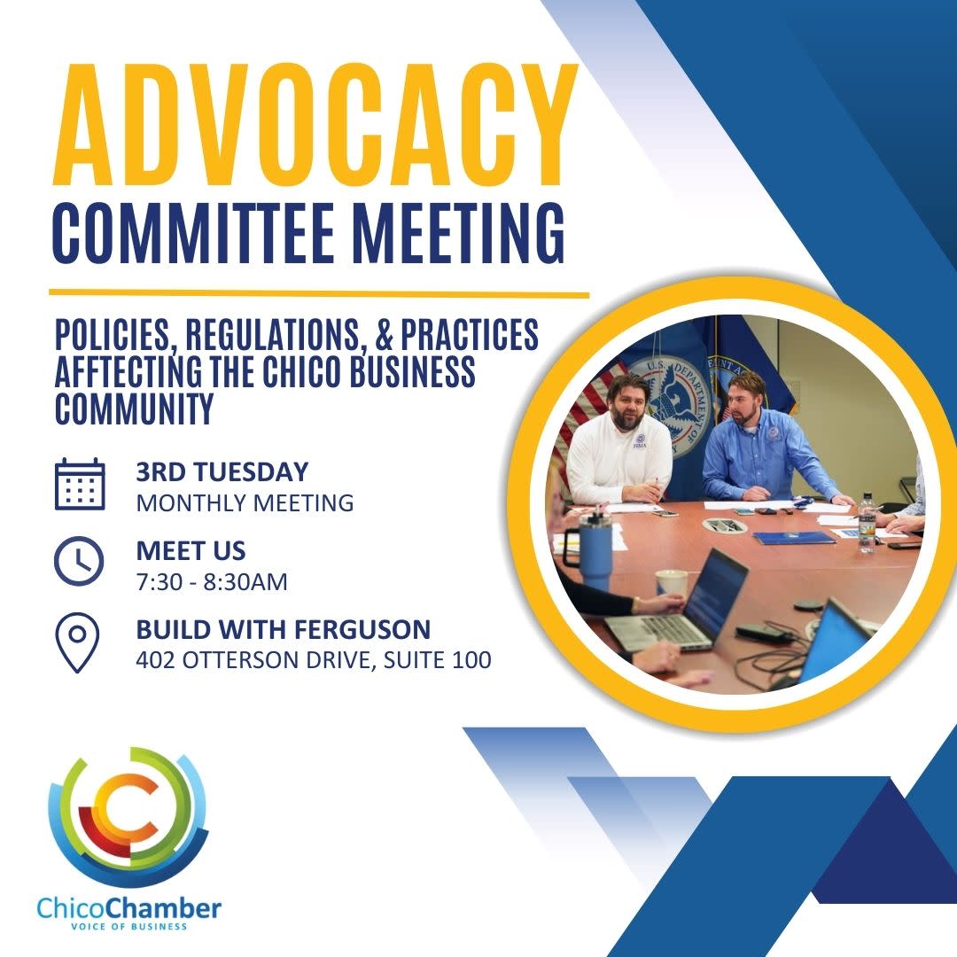 The Advocacy Committee discusses local and statewide policies, regulations, and practices, and is instrumental in determining direction and action for the Chamber on advocacy issues. The Advocacy Committee, open to all members, meets the third Tuesday of every month from 7:30-8:30am at Build with Ferguson (formerly Build.com) in Chico. Contact membership@chicochamber.com to be added to the Advocacy Committee e-mail list to receive specific meeting updates and agendas.