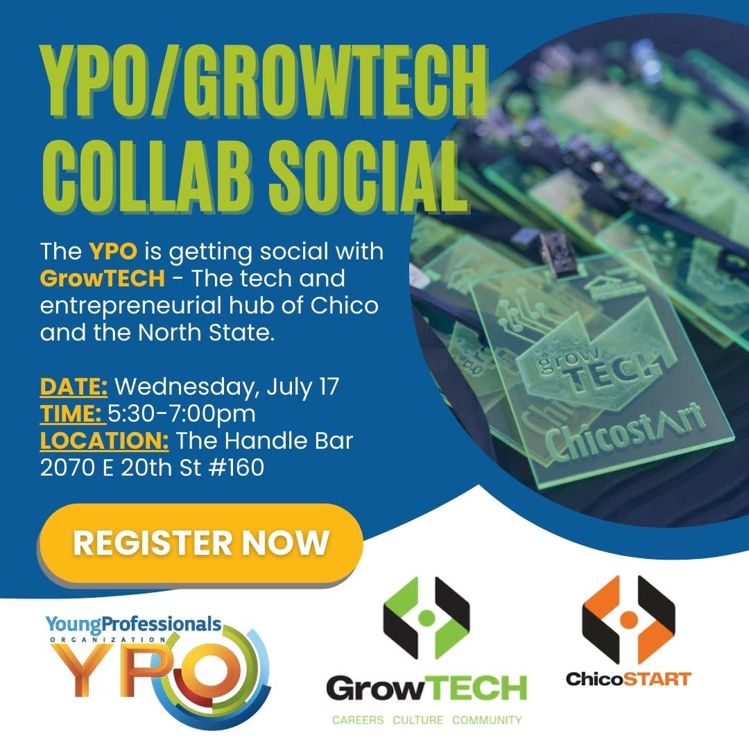 The Chico Chamber's Young Professional's Organization (YPO) is proud to announce that we will be joining forces with GrowTECH for the July 2024 YPO Social, taking place on Wednesday, July 17th from 5:30-7:00pm at The Handle Bar in Chico.