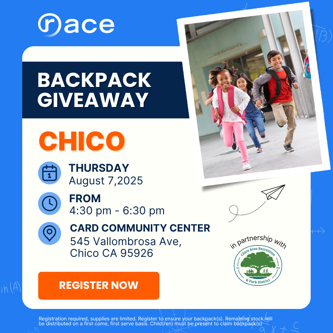 Join Chico's newest fast, affordable Fiber Internet Company, Race Communications, and CARD for a back-to-school backpack giveaway event! Backpacks are provided by Race Communications and are stuffed with school supplies. Limited number available. Registration is required in advance.