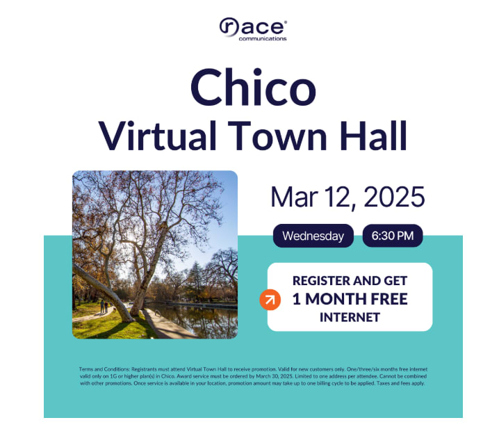Race Communications is hosting a Virtual Town Hall with their leadership team highlighting their services, how they impact business, updates on construction progress, and address any questions residents may have as we launch Race Communications services in the Chico community.