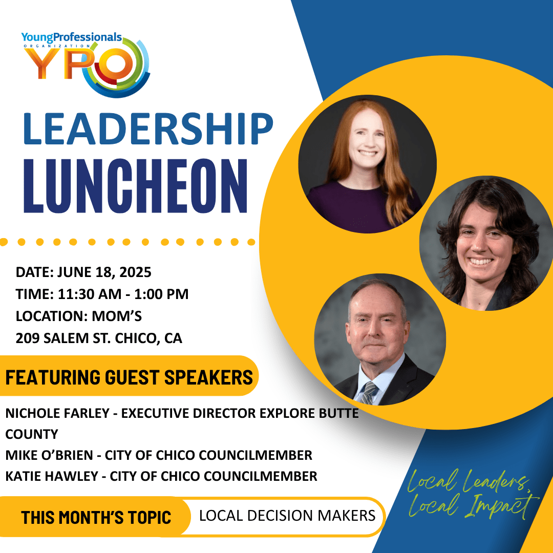 CALLING ALL YOUNG PROFESSIONALS! *Even those young at heart... Join the Chico Chamber of Commerce's Young Professional's Organization (YPO) for the June 2025 Leadership Luncheon. We are honored to welcome a panel of local decision makers, including: - Nichole Farley, Executive Director of Explore Butte County, New Chico City Council member Katie Hawley, and Mike O'Brien also a new Chico City Council Member. While dining at the ever-delicious Mom's Restaurant, we will hear about our speakers journey's to becoming local decision makers, what exactly their positions entail, and why it is so important to have a voice in our community. There will be time for Q&A at the end of the presentation, so come prepared with questions about how you can get involved! This event is open to all Chamber business members - Send your young professionals to the YPO Leadership Luncheon to further educate your employees about community impact, develop skillsets, and expand their professional networks. This is a ticketed event. Your choice of lunch will be provided. Please indicate your preferred menu item as your register . Your options include: 1. Parmesan Crusted Grilled Cheese - Made with parmesan crusted sourdough and melted pepper jack cheese with a side of the house made soup of the day. 2. Fuji Apple Salad - Made with fresh greens, candied walnuts, dried cranberries, parmesan and blue cheese with a house made shallot vinaigrette. 3. Pesto Chicken Sandwich - Made with toasted sourdough, tender chicken breast, arugula, red onion, mozzarella, and a house made pesto aioli. *If no food selection is made, you will receive the menu item #1 by default - Parmesan Crusted Grilled Cheese.Images