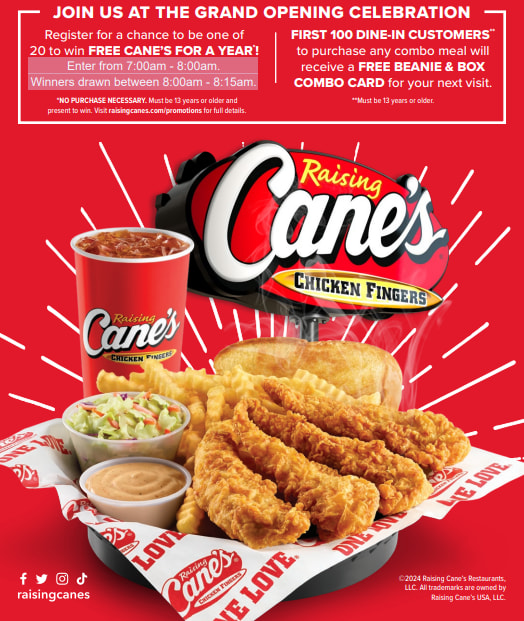 Please join us for the Grand Opening of Raising Cane's in Chico! First 100 dine-in customers to purchase any combo meal will receive a FREE BEANIE & BOX COMBO CARD for our next visit. Register for a chance to be 1 of 20 winners to receive FREE CANE'S FOR A YEAR! *Enter from 7:00-8:00am. Winners drawn between 8:00-8:15am. No purchase necessary. Must be 13 years or older and present to win. Visit www.RaisingCanes.com/promotions for full details. Don't miss this AMAZING CELEBRATION as we welcome Raising Cane's Chicken Fingers to the Chico community!